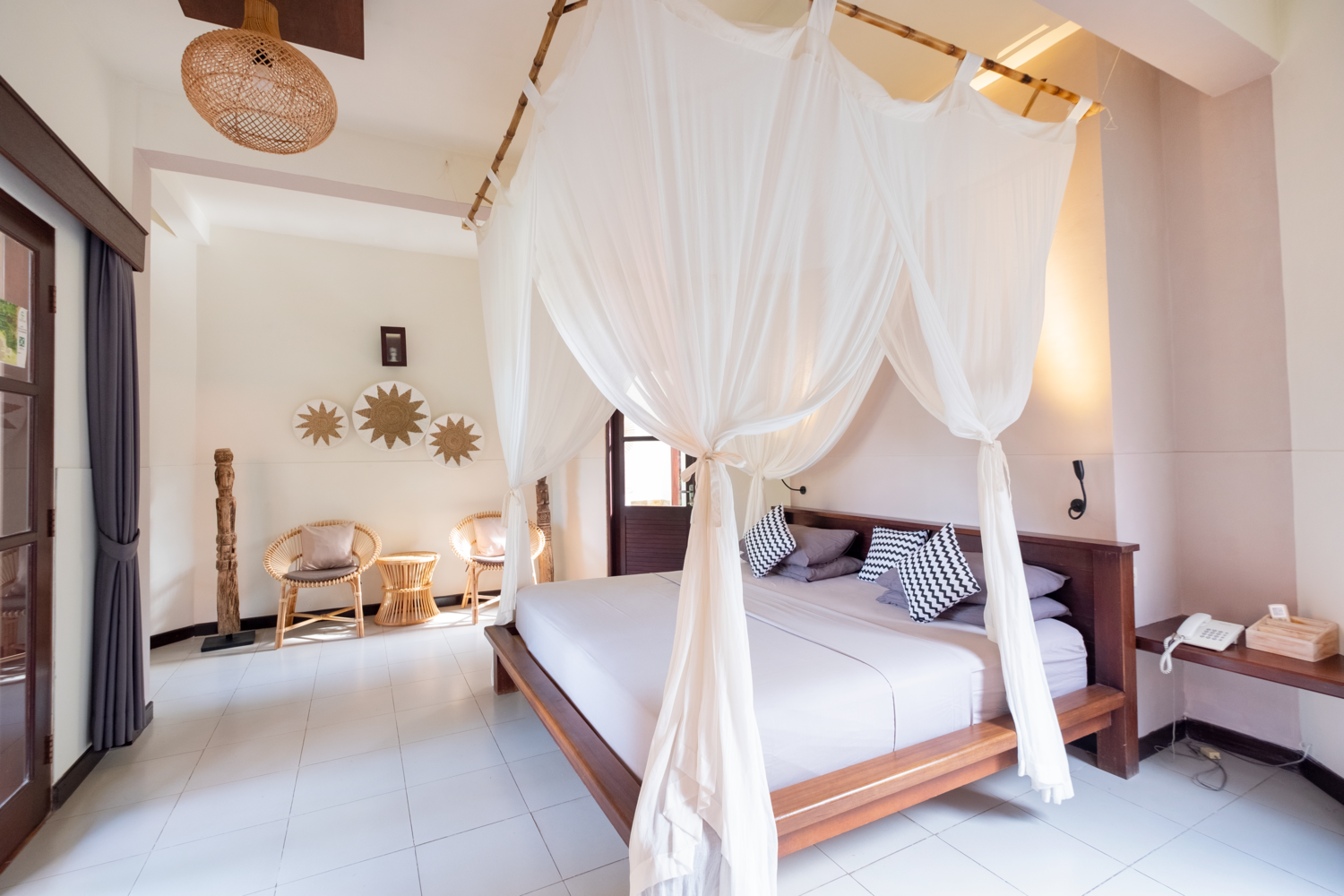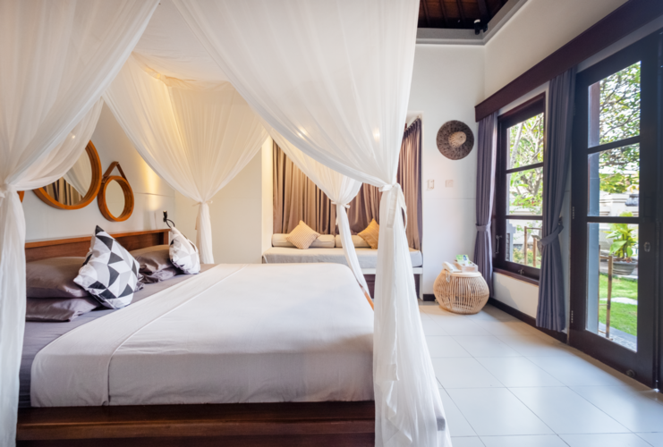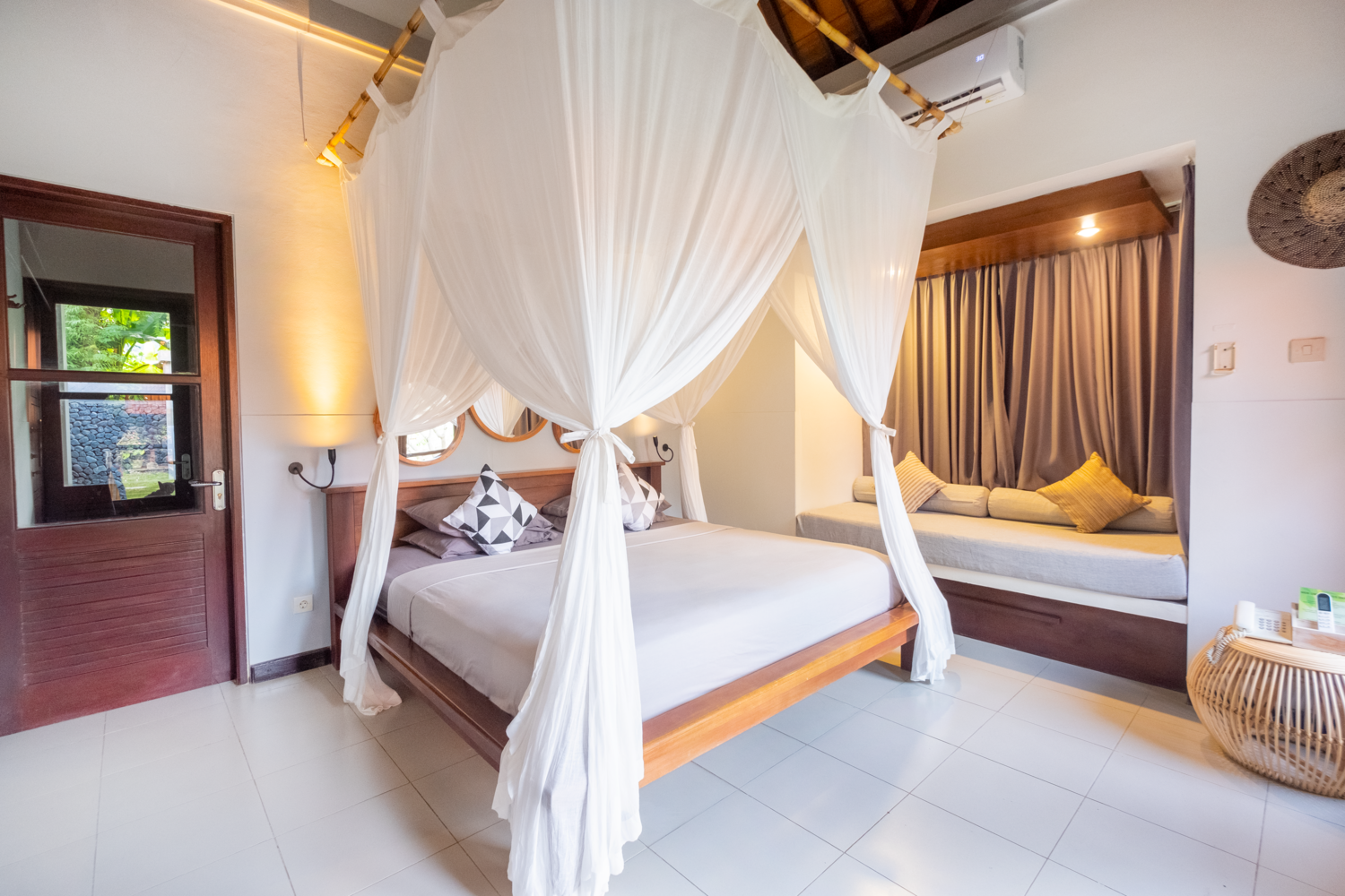 3 Master Suite : features spacious space, A/C, TV, DVD Player, In-Room Safe, Desk, Sitting area, Mosquito net, Open air Shower, en-suite King Bathroom 1 Junior Suite : Air conditioning, en-suite queen bathroom, Terrace, Desk